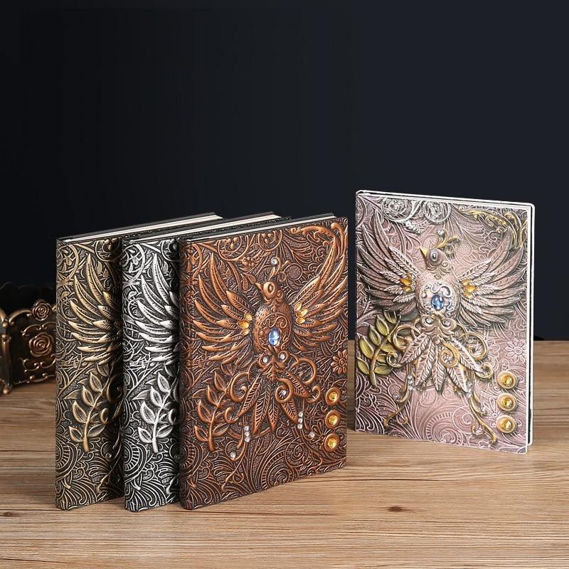 Made from high quality PU leather with a gorgeous phoenix themed print embossed on the front and back. Embellished with rhinestones and an exquisite satin ribbon bookmark.